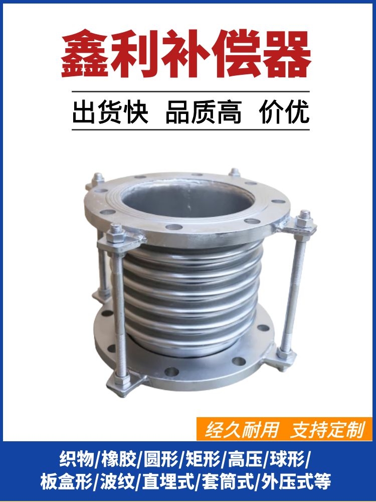 伸缩器也称伸缩节、膨胀节、补偿器、伸缩接头。伸缩器按材质分为:钢制伸缩器、橡胶伸缩器、不锈钢伸缩器。伸缩器在一定范围内可轴向伸缩,也能在一定的角度内克服管道对接不同轴向而产生的偏移,方便阀门管道的安装与拆卸,在管道允许伸缩量中可以伸缩,一旦越过其伸缩量就起到限位,确保管道的运行。主要为保障管道运行,具有以下作用:补偿吸收管道轴向、横向、角向热变形;吸收设备振动,减少设备振动对管道的影响、地陷对管道的变形量。